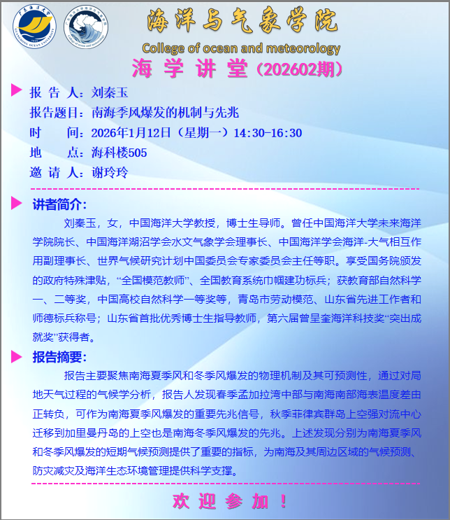 【学术会议通知】海洋与气象学院“海学讲堂”(202602期)