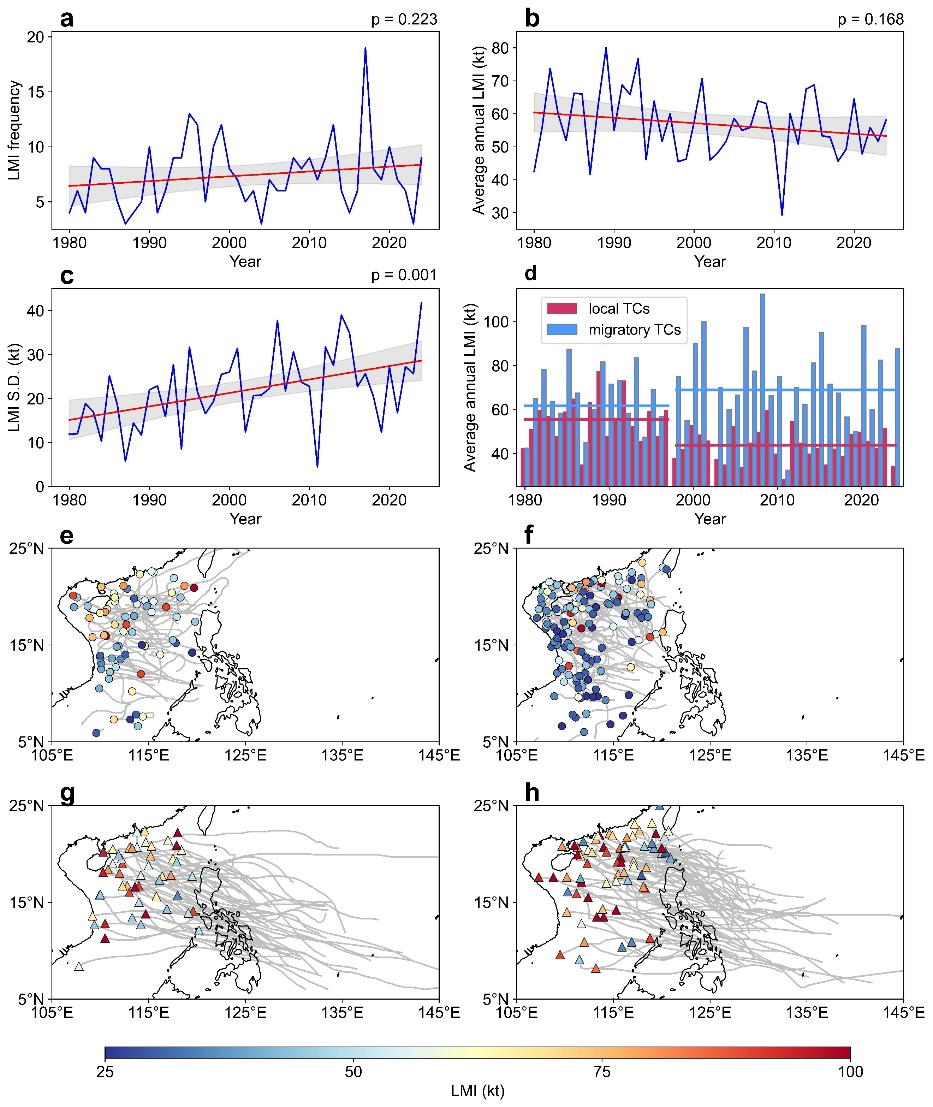 台风最大生命强度(Lifetime Maximum Intensity, LMI)是衡量台风生命周期内最强风力的核心指标,更是评估其潜在破坏力、制定精准防灾减灾策略的关键依据。团队首次系统揭示了南海台风LMI的长期变化特征——其强度变异性正呈显著增强态势。自20世纪80年代以来,南海台风LMI整体呈现出明显的“强度扩散”趋势,但这一宏观特征下隐藏着两类台风的截然相反变化:南海本土生成的台风强度呈减弱趋势,而从西北太平洋“迁徙”进入南海的台风强度则显著增强,形成独特的“强度跷跷板”现象。