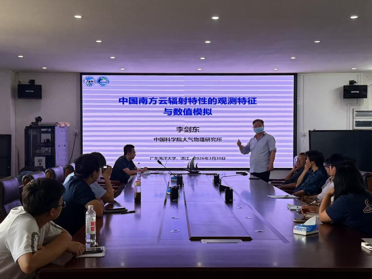 2026年3月30日下午,海洋与气象学院在海科楼505会议室举办了2026年第12期“海学讲堂”。本期活动邀请了中国科学院大气物理研究所地球系统数值模拟与应用全国重点实验室项目研究员李剑东,为师生作了题为“中国南方云辐射特性的观测特征与数值模拟”的学术报告。学院教师及二十余名研究生、本科生共同参与了此次活动。