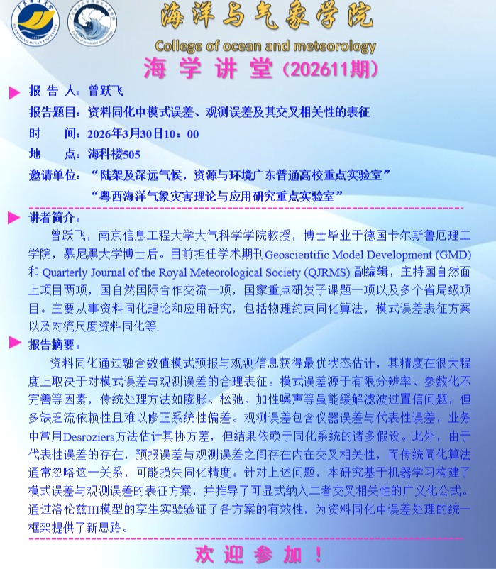 【学术会议通知】海洋与气象学院“海学讲堂”(202611期)